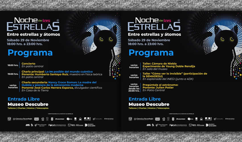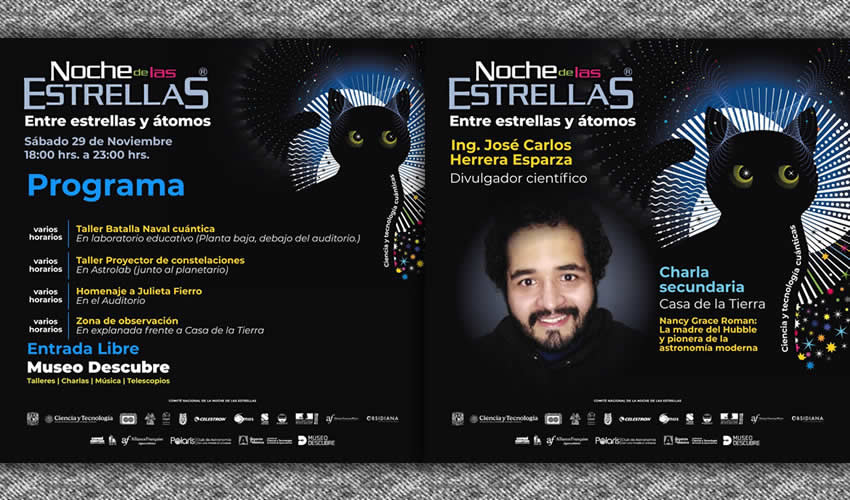 Este sábado 29 de noviembre, desde las 6:00 de la tarde en el Museo Descubre, viviremos el evento de astronomía y divulgación científica más importante de Latinoamérica: la Noche de las Estrellas; habrá talleres, charlas, música y observaciones con telescopio.